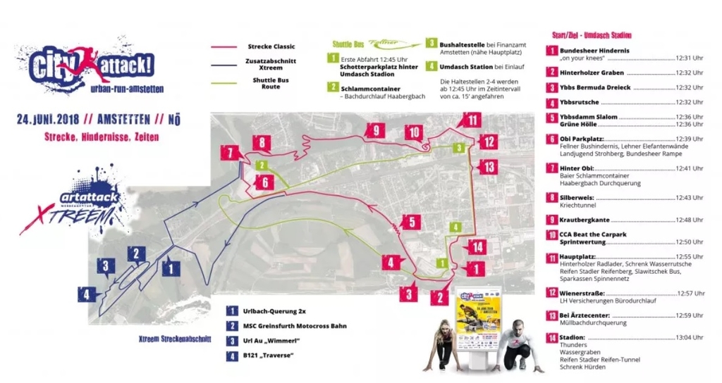 (ti) Die City Attack stellt eine Herausforderung für Sportler mit unterschiedlicher Fitness dar. Gefordert sind neben einer gehörigen Portion Kondition und Ausdauer, vor allem auch Geschicklichkeit und Mut, führt der Lauf doch über eine Menge Hindernisse und Hürden, die die Stadt so bietet: Flussdurchquerungen, Parkhauspassagen, „parkende“ Autos, steile, triefendnasse, stadtnahe Waldpassagen… Diesen Herausforderungen stellten sich am heutigen Sonntag Günter T. mit seiner Steffi in Amstetten. Und das gleich bei zwei Bewerben: Neben einem Sprintbewerb über 200 m - dem sogenannten "Carpark-Sprint" ging es dann mit der 10 km langen "City-Attack" richtig ans Werk. Unsere beiden Grünen schlugen sich beachtlich und erreichten Hand in Hand nach knapp 92 Minuten erschöpft aber glücklich das Ziel!