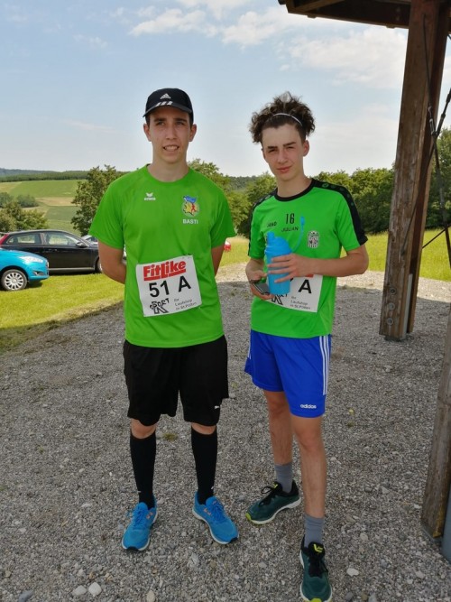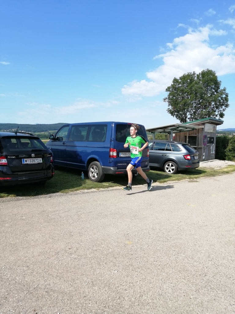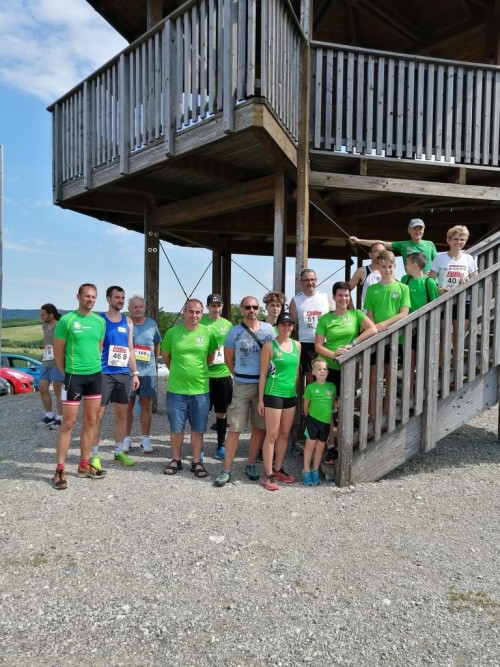 (ti) Wieder mal ein Lauf in unserer Heimat! Walter Zugriegel's Erfindungsreichtum ist ja bekannt. Diesmal hat er sich wieder mal ein ganz besonderes Format einfallen lassen. Vor dem Hauptlauf gab's einen Staffellauf (2 Läufer pro Team), wobei von jedem Teilnehmer abwechselnd 2 Runden zu laufen waren. Nach dem Start bei der Warte ging's nach rund 200 m rechts in einen 650 m langen Hohlweg hinunter. Nachdem man diese Herausforderung geschafft hatte, ging es dann 400 m mit knackigen 45 Höhenmetern wieder zurück zur Warte. Insgesamt konnten wir in der Staffel 12 Starter verzeichnen, beim Hauptlauf waren 8 Grüne mit dabei. Erfreulicherweise konnten wir heute mit Tim, Jakob, Julian u. Bastian gleich 4 Läufer unter 16 Jahren stellen, wobei Bastian u. Julian auch beim Hauptlauf tolle Leistungen zeigten!