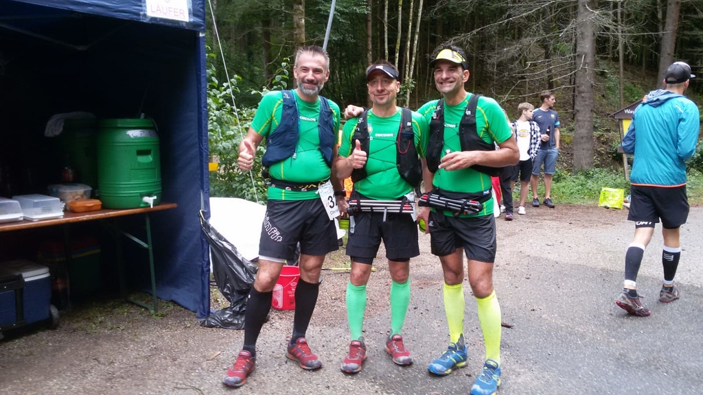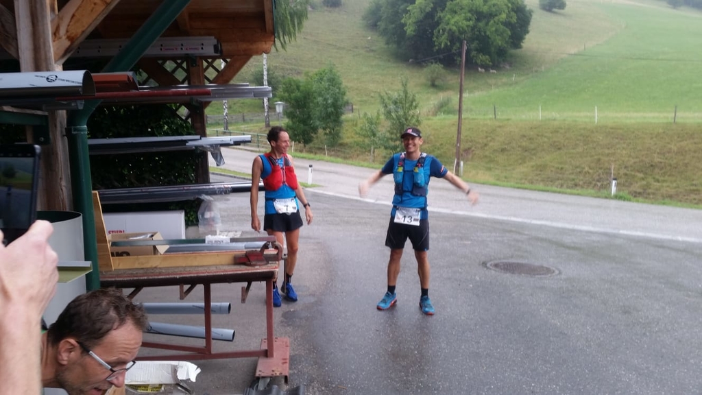- ⛈ Km74-CP7-16:01-Hohenstein: so schnell kann sich ein Wunsch erfüllen. Auf dem Verbindungsweg zum Hohenstein erwischt uns voll der Regen. Da hat mich OBEN einer falsch verstanden- wollte nur kühlere Temperaturen. Schrecksekunden, als ein Blitz in unmittelbarer Nähe einschlug. Wir kommen etwas feucht und unverletzt in der Hütte an. Trinken- nachfüllen. Markus und Peter konstant 45min vor uns.