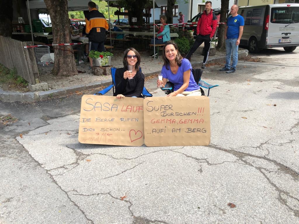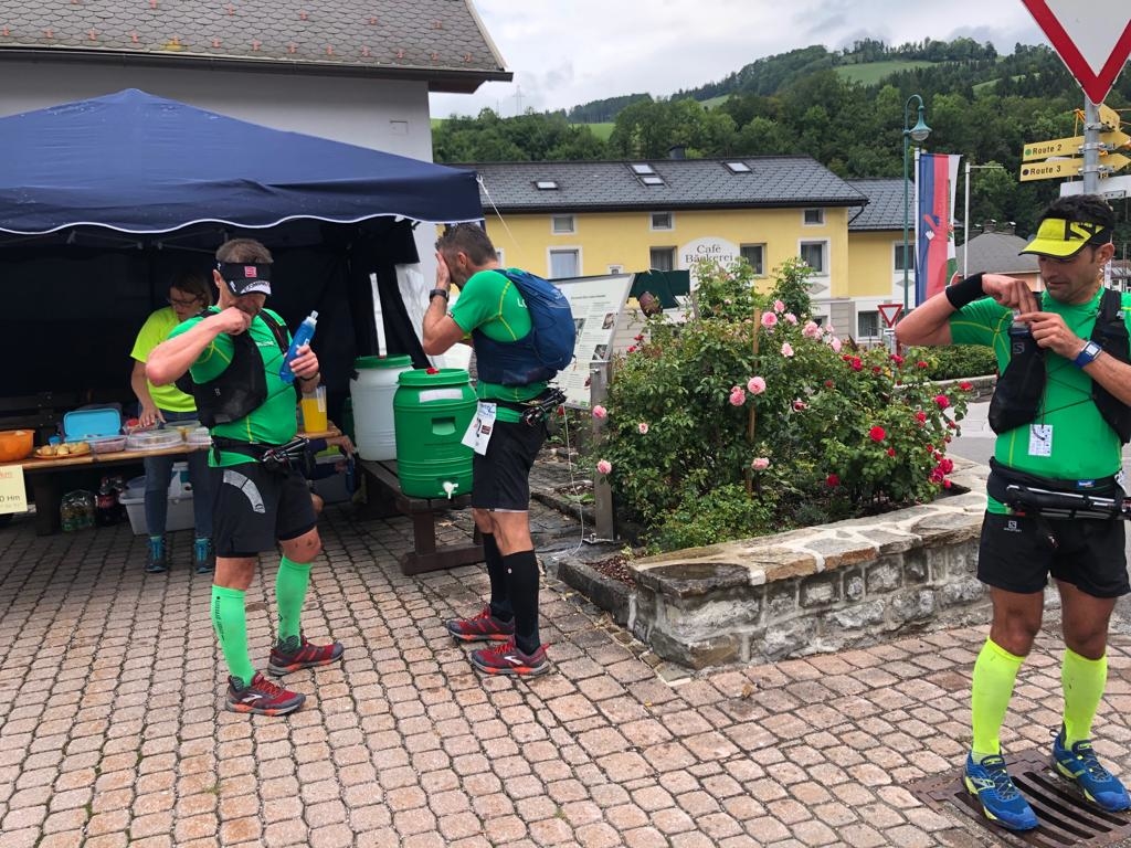 - Km48- CP4-11:25-Frankenfels: Angefeuert durch Rene, Andi und Tinki laufen wir zum Checkpoint, wo wir von unseren Fans (Evelyn und Edeltraud) lautstark begrüßt werden. Das stärkt das Ego ungemein. Wieder trinken-nachfüllen- essen. Markus und Peter sind 45min vor – haben die einen Elektro-Motor im Schuh?