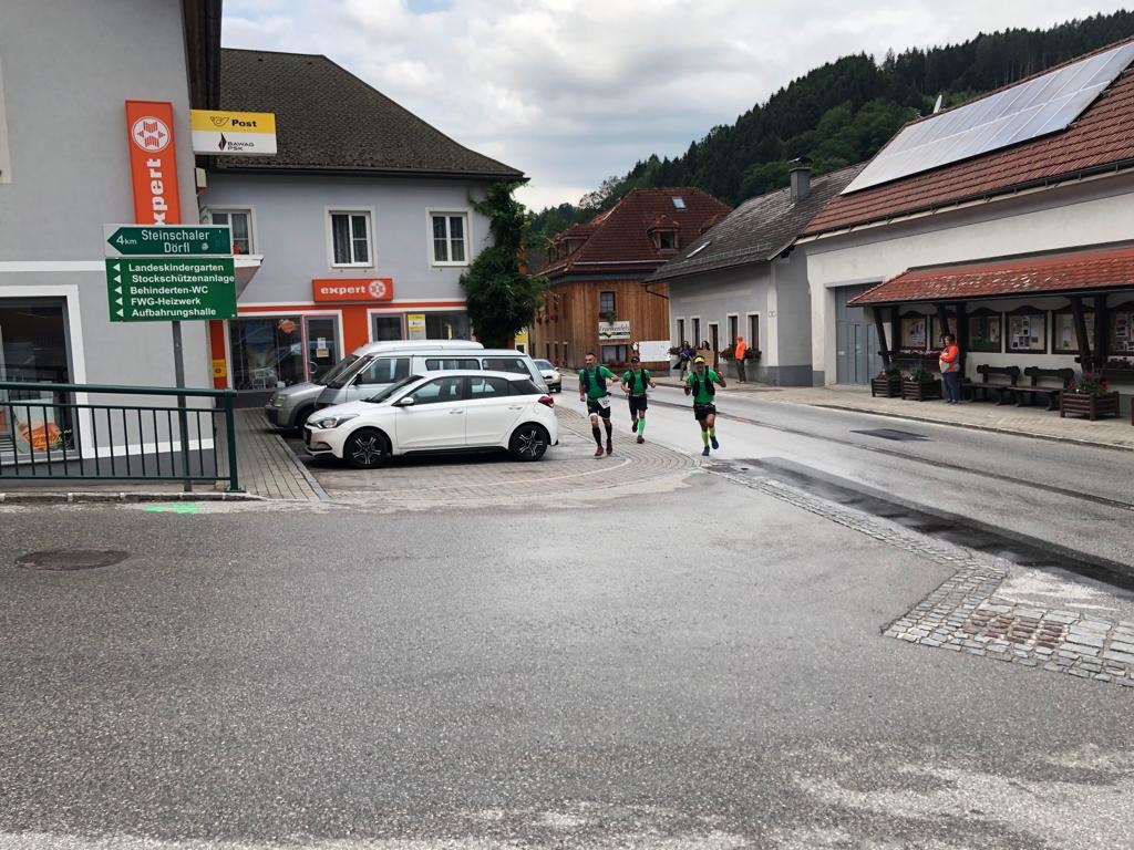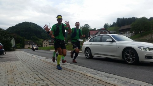 - ⛅ Km83,5-CP8-17:06-Schrambach: Mit einer 5:40 Pace den Hohenstein runter – und wieder kommt uns vor dem CP ein bekanntes Gesicht entgegen- Bernadette – da ist wohl ein grünes Nest im Pielachtal. Sie begleitet uns bis zum CP8, wo wir wieder vom Fanclub erwartet werden. Markus und Peter jetzt schon 55min vor uns – sind wohl „runtergeflogen“ nach Schrambach.