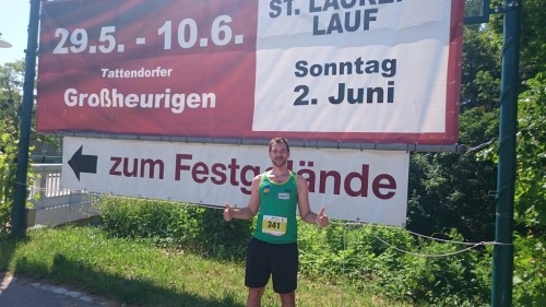 (ti) Über 500 Starten in allen Bewerben waren heuer beim 9. St.Laurent-Lauf in Tattendorf gemeldet - zugleich auch die 6. Station der Thermen Trophy. Die Strecke war heuer extrem schwierig und anspruchsvoll, hatte es doch die ganze Woche vor dem Lauftag geregnet. Und am Lauftag selbst hatte es schon beim Kinderstart um 9 Uhr 23 Grad und extrem hohe Luftfeuchte. Speziell die zweiten 5 Kilometer in den Weingärten waren für die Läufer bei diesen „tropischen“ Bedingungen eine echte Herausforderung. Diese zweite Runde hat sich aber Josef erspart, er war beim 5er am Start. Bei diesem Lauf - eine Mischung aus Cross- und Straßenlauf ist die Strecke entsprechend attraktiv: der Start/Ziel-Bereich befindet sich inmitten des Großheurigengeländes, die Laufstrecken selbst sind vielfältig und führen einerseits durch die Tattendorfer Auen und andererseits durch die Weingartenrieden. Josef benötigte heute für die 5000 m 23:08,8 min ,was heute nur für Platz 11 in der AK 30 reichen sollte. Was Josef leider damit nicht erreichte: Das besondere an diesem Lauf ist, dass die Sieger bei Damen und Herren werden in Tattendorfer St. Laurent – der auch international geschätzten Rotweinsorte – aufgewogen werden.